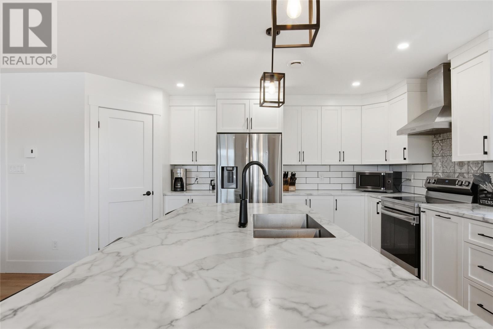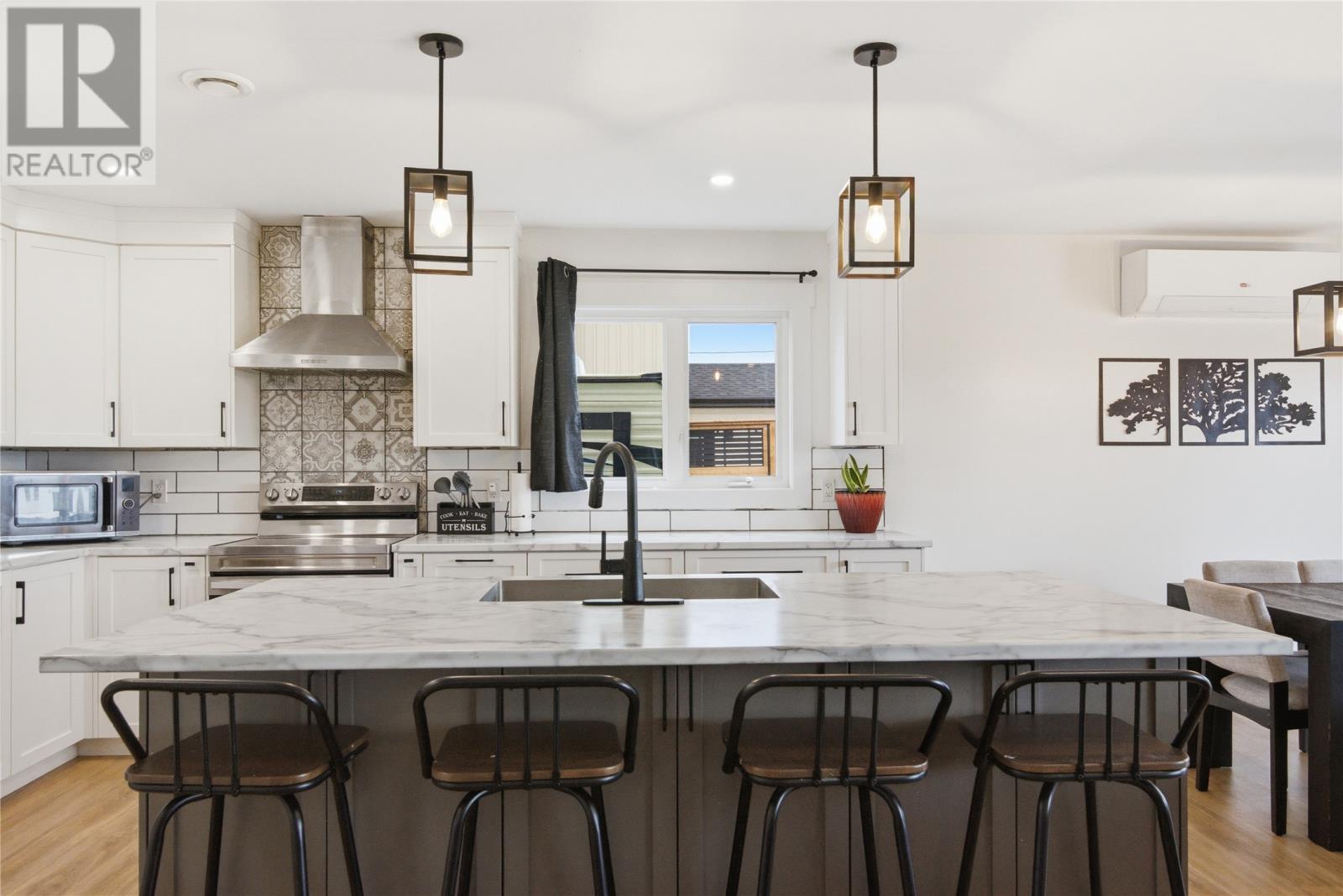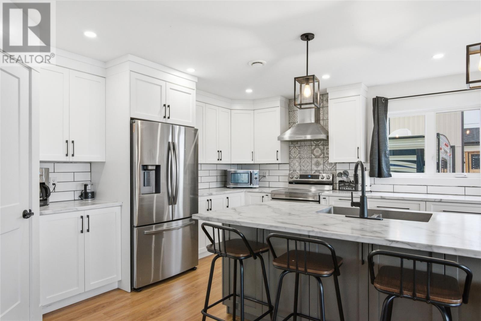 144 Penwell Avenue, Gander — 2023-built bungalow offering approximately 2,900 sq ft of finished living space on two levels in one of Gander's most sought-after new subdivisions. The main floor features a bright, open-concept layout with luxury vinyl plank flooring and oversized windows throughout. The designer kitchen is the centrepiece — white shaker cabinetry, a large island with marble-look countertops and seating for four, subway tile backsplash accented by decorative tile behind the range, stainless steel appliances including a french-door fridge, and a walk-in pantry. The kitchen flows into a dining area with patio door access to the rear deck, and a spacious living room anchored by a tiled electric fireplace with reclaimed wood mantel. Three bedrooms on the main level include a primary suite with walk-in closet, 4-piece ensuite, and private balcony. A second full 4-piece bathroom and a foyer with closet complete the main floor. Attached garage with inside entry. The fully developed lower level adds two additional bedrooms, a third full bathroom, a large rec room, a dedicated home gym, a separate laundry room, and ample storage. Large above-grade windows keep the basement bright and functional. Comfort features include a ductless mini-split heat pump for efficient heating and cooling, electric baseboard heating, HRV system for fresh-air circulation, and modern matte black fixtures and designer lighting throughout. Exterior highlights: paved driveway, fully fenced rear yard, rear deck with room for outdoor dining, primary bedroom balcony, and mature neighbourhood amenities nearby. Balance of the 7-year Atlantic Home Warranty transferable to the new owner. A turn-key home built to current standards with thoughtful finishes throughout. As per Seller's Direction, no offers will be presented until April 27 at 11AM - please leave all offers open for acceptance until 1PM the same day. (id:27222)