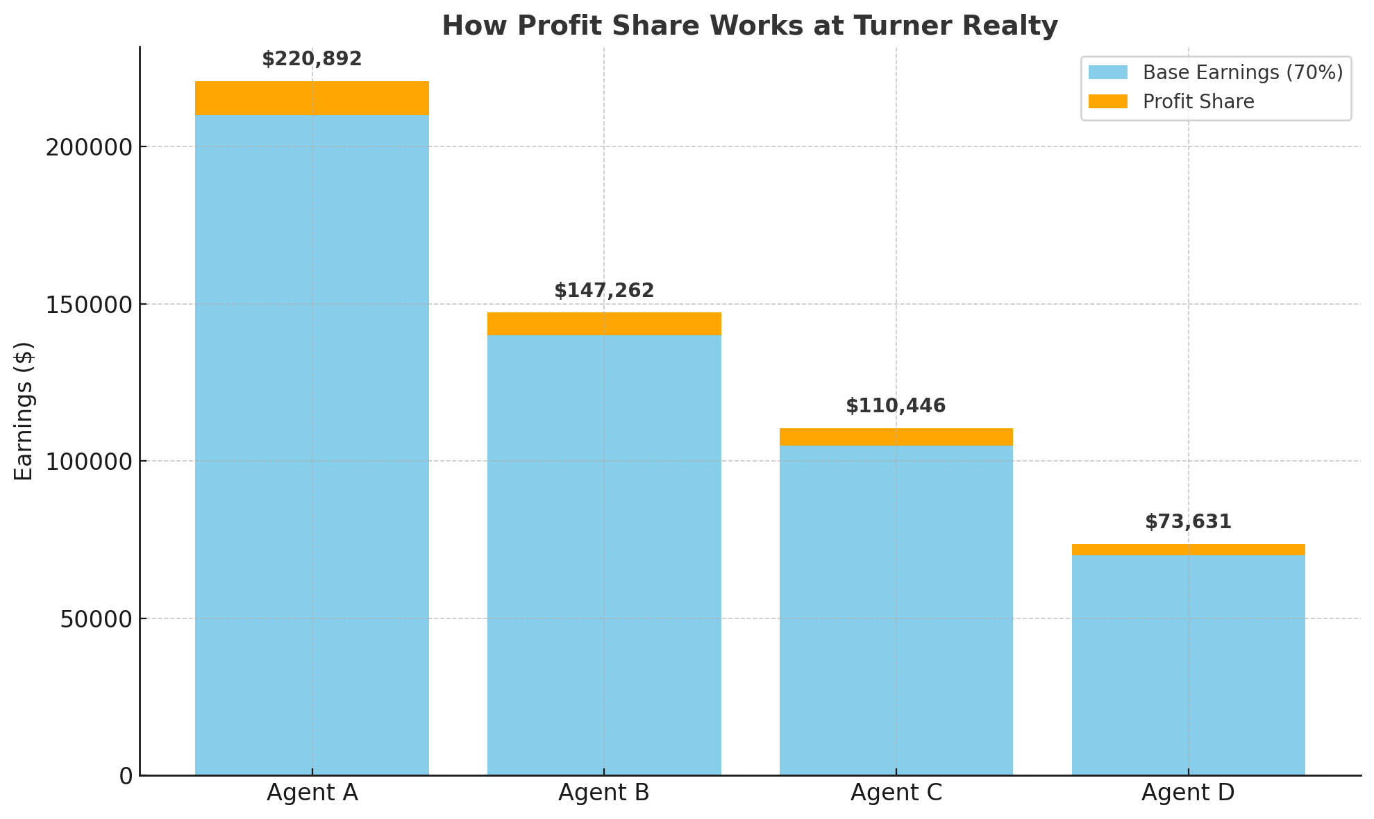 At Turner Realty, we’ve redefined how REALTORS® succeed. Instead of outdated commission splits, our Profit Share Model ensures every agent benefits from the company’s success. Your income grows with your production, not with recruiting uplines or downlines.